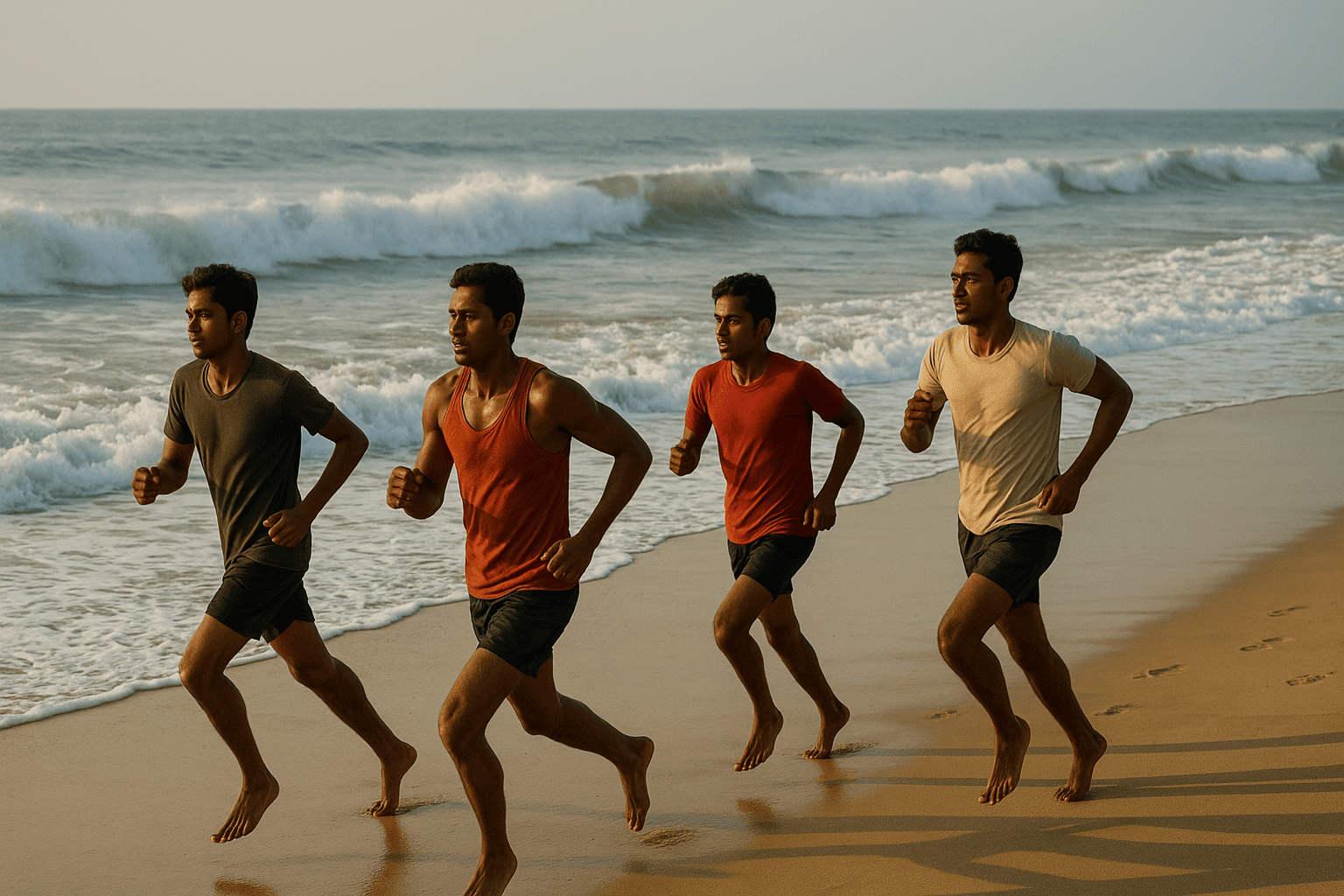 Imagine running along the breathtaking Maravanthe coastline, where the Arabian Sea waves dance on one side and the Souparnika River flows gracefully on the other. The Trasi Maravanthe Run invites you to experience the thrill of endurance amidst nature's finest canvas — golden sands, sea breeze, and the symphony of waves guiding your every stride. Runners along the shoreline.